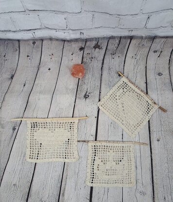 This is a crochet saving package for 3 wall hanger patterns, for a cute Heart, Butterfly and crown wall hanger. Light and very Summery wall hanger decoration. Bring some summer into your house with this cute decoration, the pattern can be worked in many different Colors to bring some extra Color into the house. The pattern contains two row-by-row explanations, one for filet crochet beginners and one for filet crochet experienced or can be worked with the graph. It is very important to read the info’s in the pattern before starting. This pattern is super quick worked and also great to use up some left over yarn. Approx. 18 x 16 cm If a yarn with the same gauge is used