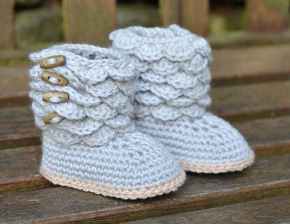 These little booties are unique, and guaranteed to keep tiny toes snug and comfy. The cuffs are made with a unique method of layering scallops that I developed as a pretty alternative to crocodile stitches.