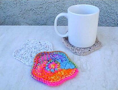 A very pretty, lazy scallop design, looks like a delicate flower! Very pretty in variageted yarns, or pastels! These knit up quickly , so you will want to make lots of these for gifts. Dont forget the folks at the office. Knit up one for their coffee and tea mugs too. Uses small amounts of worsted weight yarns, knitting needles, US # 6 and # 8. Finished coaster is about 4 in diameter. This is a short pattern, easy to follow!