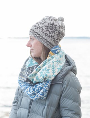 Scandi Cowl features some of my favorite motifs, adapted from my book 150 Scandinavian Motifs. A super way to practice and explore the beauty of Scandinavian stranded knitting. Knit as a long tube in the round beginning with provisional cast on and joined with kitchener stitch after blocking to form a continuous loop.