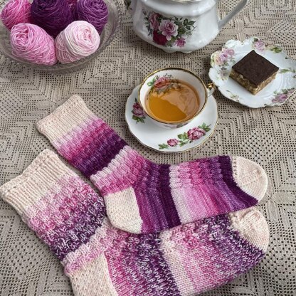 These socks are all about mini skeins! There are two options for thickness - single stranded using mini skeins, and double stranded using a solid held double with mini skeins! The patterning is easy to memorize once the pattern is established.