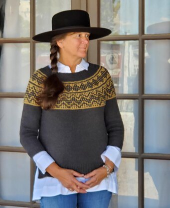 The highlight of this simple but elegant pullover is its garter stitch mosaic yoke. Mosaic knitting is a great way to create bold graphical elements without stranded color work.
