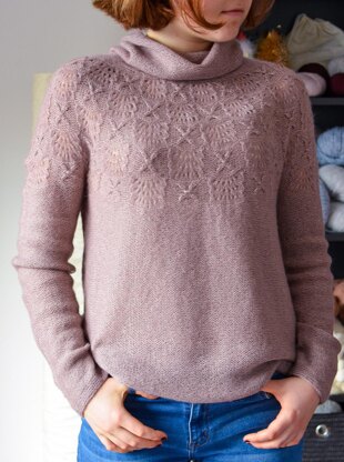 Itis worked seamlessly from the top down, starting with the wide cosy turtleneck in reverse stockinette (knitted on wrong side), followed by circular yoke. After the yoke, the body and sleeves are separated and further worked in reverse stockinette as well.