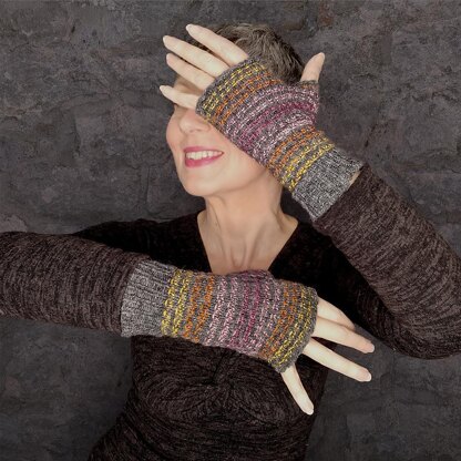 Scintillio mitts are worked in the round, starting from the border in k1/p1 rib. The palm is worked using a simple striped slip stitch pattern with a thumb gusset for comfort. Thumbhole sts are placed on waste yarn and the body finished continuing in the slipped stitch pattern. The mitts are finished with the same 1/1 rib of the wrists. The thumb stitches are then placed back on needle and worked in the same way as the rest of the body.