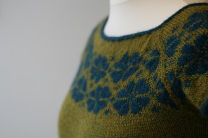 This pretty, sleeveless sweater has a traditional Fair Isle flower motif on the yoke and is seamlessly knit from the top-down, so you can make sure it fits to your liking as you knit. The raglan construction creates a flattering boat-neck and an i-cord cast off adds interest to the neckline and sleeve edges.