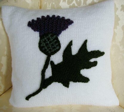 The thistle is knitted separately using small oddments of yarn with an I - cord for the stem together with stocking stitch, and a rib pattern for thistle. A small amount of embroidery completes the base of the flower. Each element is fully explained in the pattern leaflet.