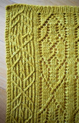 The pattern includes a chart for the lace and cable work. The even rows of the lace is worked in plain purl. The lace and cable stitches involved include: