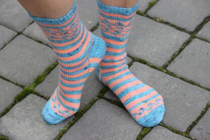 These fun, colorful socks are worked from the top down with a heel flap and gusset. Worked in two colors of sock yarn with a simple stripe, the fair isle adds tiny bit of challenge to this otherwise straightforward knit.