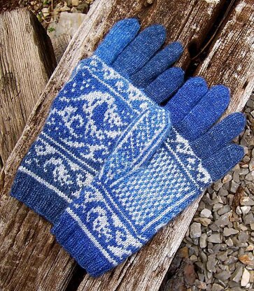 These gloves require about 50 g of fingering-weight yarn in each main and contrasting color. Any superwash yarn will do, but wool blends with nylon is the best choice as those yarns are especially durable and form-stable. The recommended gauge (35 x 35 in 10 cm) is for size small only. For other sizes, adjust your gauge accordingly. Instructions are written for circular needles (magic loop method); adjust if using DPNs.