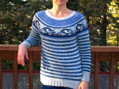 This easy-to-make & wear, all-season sweater combines all things I admire - stripes, colorwork, and almost seamless construction. Knitted in the round, it requires almost no finishing. The body and sleeves are worked bottom-up, and later join in the round yoke. The back neck is shaped by short rows; I don't explain short row technique in the instructions assuming you know how to do it.