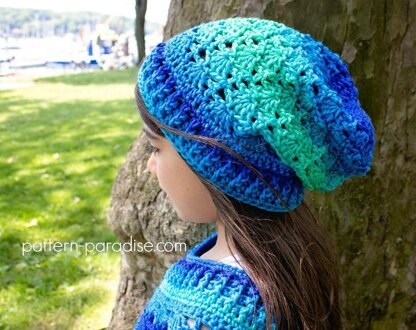 This pretty hat can be worked as a beanie or slouch and has a pretty shell design. The self striping yarn makes the color changes super easy. The hat has a coordinating poncho sized from baby to 5X!