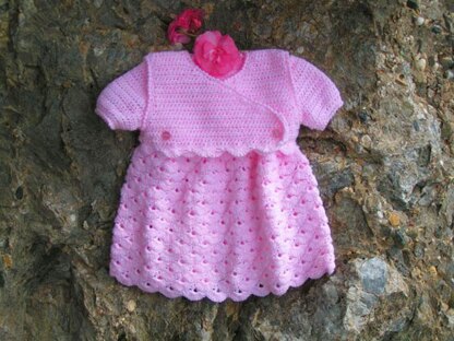 Materials: Dress: 4-ply yarn 3(4) x 50 g balls [206m/225yds]; Bolero: 2 balls as above; 3.5 mm crochet hook; 4 small buttons for dress; 2 for bolero