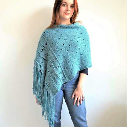 Knitted in aran/worsted yarn, it is a lighter knit for mid-season. The poncho with beaded fringe and sparkly thread, is a statement piece and looks great with jeans or flowy skirt. The wrap would be great on a summers’ eve, or over a winter coat. The fringe, beads and sparkly thread are optional and the poncho/wrap still looks great without.