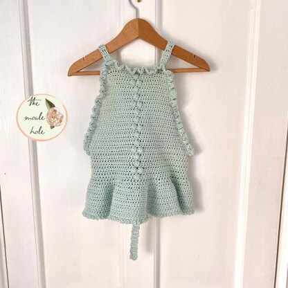 A puffy little summer top. Super frilly with tie straps that grow with your little one. This could easily be made into a dress.