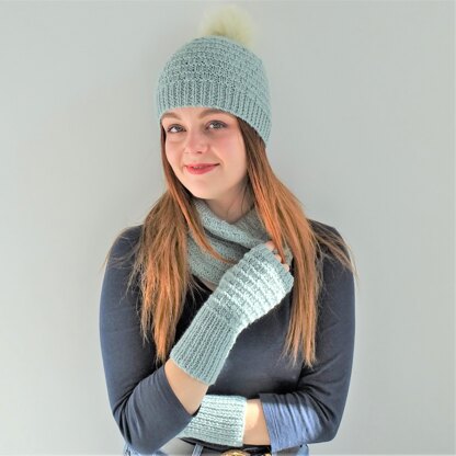 Sea Waves hat, fingerless mitts and cowl. (Please note that these items were available separately, but now have been made into a set.) Each matching item has a textured stitch pattern that is reminiscent of wave after wave on a windy day.