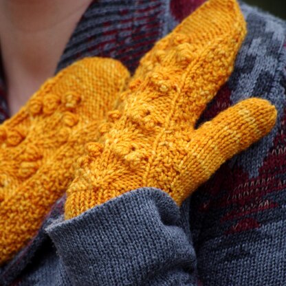 A fun set of mittens with golden berries growing up the back of the hand and a highly textured moss stitch palm.