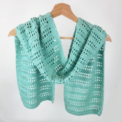 The Seafoam Scarf is a beginner-friendly crochet project alternating open stitch filet crochet rows with solid rows to create a light, airy fabric with plenty of structure. The aqua yarn reminds me of the gentle waves of the ocean, and the cotton and rayon yarn provides beautiful drape without being too warm. This is a perfect scarf for a cool summer night by the ocean. This pattern would be good for a beginner who needs to practice tension and stitch consistency.