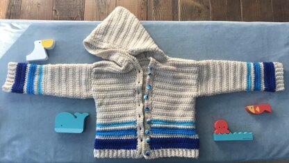 This is a hooded cardigan for babies and young children with cute ombre stripes at the hem and cuffs and buttons to close. The stitch used is linked treble crochet; it takes a little longer to work than your usual treble but creates a beautiful dense but stretchy fabric. It gets rid of any gaps between the stitches, which makes the hoodie cozy enough to be worn as a jacket in the spring and autumn. It is such a relaxing meditative stitch to work that you will have as much fun making it as the little ones will have wearing it!