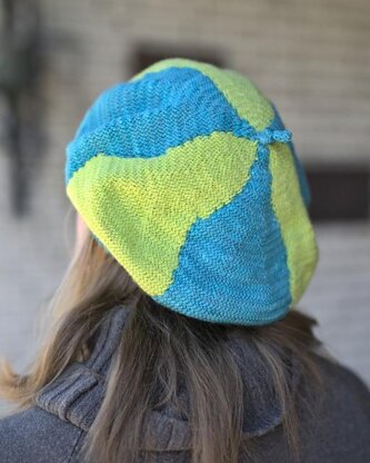 A two-color wave pattern decorates this tam-style hat. The crown is worked in rows, with six open loops, switching between colors to accommodate the waves.