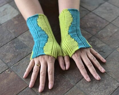 Two different kinds of waves make these mitts unique: At the back of the hand, the line between the two colors moves like a wave. At the other side, one long wave is formed with overlapping short rows.