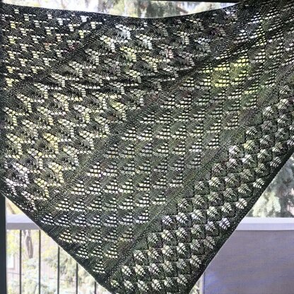 The finished size should be roughly about 72” on the longest edge after blocking, but feel free to keep going by adding more layers of lace on if you have enough yarn. I used almost 2 full skeins of Hedgehog Fibres skinny singles.