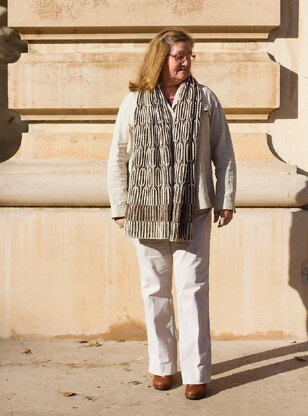The finished accessory weighs less than 250 grams ( 9 ounces) and is therefore light and airy. The cashmere, alpaca, and merino yarn combination however will provide exeptional warmth and a luxurious cozy feel. All you need are 5 balls rowan finest rare (beige) and 5 balls rowan finest glee (brown) and 3 yards contrasting color yarn for the Italian cast on. A circular knitting needle 4 mm/ 6 US about 24 inches long and 1 needlepoint needle to graft the Italian bind-off. Cable needle or stitch marker. Gauge 4” x 4” = 22 st. x 23 rows, before blocking; 14 1/3 st. x 21 rows, after blocking. You will also need a basic knowledge of the 2-color brioche stitch. The increase and decrease stitches are explained in the pattern. No matter if you like knitting by chart or by row instruction, both are included.