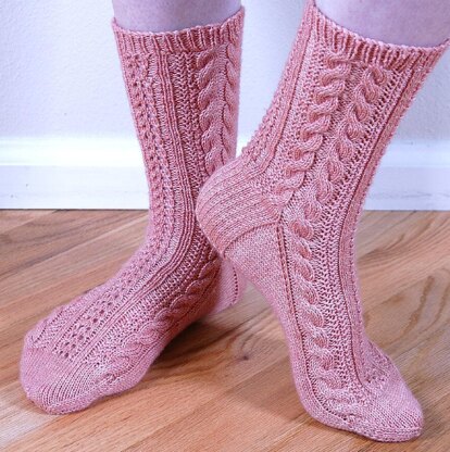 Cables, seed stitch, and a little bit of lace adorn these cuff-down socks. Available in two sizes.