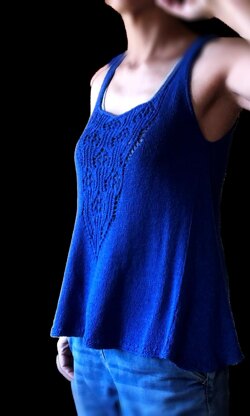 A dramatic lace pattern adorns the neckline and front of this otherwise simple-to-knit A-line tank. Worked from the top down, this tank is knit both flat and in the round for the perfect fit.