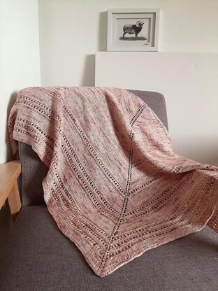 This triangular shawl is worked from the top down, starting with a garter-tab cast-on. Yo increases are worked at each end and down the centre of the shawl. It features a repeated lace stripe interspersed with stockinette stitch, and is finished with a garter stitch border.