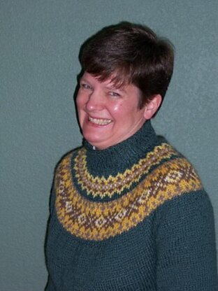 This yoke sweater is a gorgeous exercise in color-work/stranded knitting. The pattern directions include colorways using three different yarns: Elanns Peruvian -- 8 (8, 8, 9, 9)balls mc; 1 ball each CC1 - CC5 Knit Picks Wool of the Andes -- 8 (8, 8, 9, 9)balls mc; 1 ball each CC1 - CC5 Brown Sheep Nature Spun -- 7 (7, 7, 8, 8) balls mc: 1 ball each CC1 - CC5 (note: you'll have enough left over of the yarns to make a matching cap -- a wonderful way to make a swatch!)