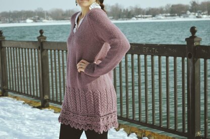 The Seraphina Tunic is a long tunic/ sweater dress design featuring an intricate bottom edge. The design is knit in the round from the bottom up and starts out with a cable section moving into stockinette and a gentle A-line shaping up to the bust. The sleeves are knit separately and joined to the bust to work raglan shaping as one piece flat with a deep V neckline. Afterward the lace edging is knit as one long strip, the ends are joined and it is seamed to the bottom of the tunic. This design has a feminine, whimsical and romantic feel. It is great for layering in the cool months and for wearing over leggings and tights. Knit up in Berroco Ultra Alpaca it is warm, fuzzy, and wont break your budget!