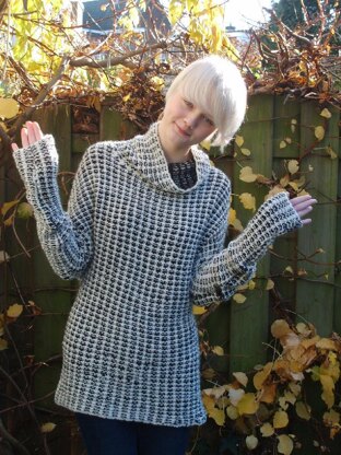 A high fashion slouchy sweater in two-color slipstitch with a nice warm cowl neck. The seemingly complicated colorwork is created throughout in the same 4-row slipstitch pattern, meaning you never have to work more than one color at a time!