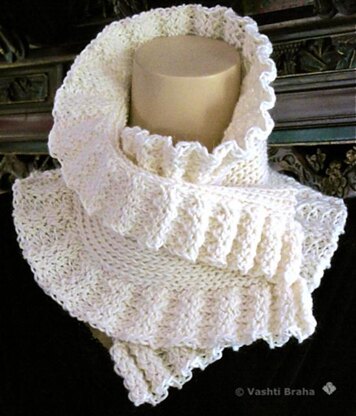 Not knowing how much yarn a scarf size would require, I made the one shown just long enough to overlap comfortably as a neck warmer. The pattern includes easy information and styling suggestions if you wish to increase the length and/or width. The one shown required less than two skeins.