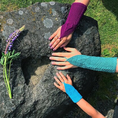 The sharqi is a biannual wind in the Middle East that blows from the southeast. Its name is derived from the Arabic word for east. These gauntlets, sized for children to adults, imitate that sand and height with seed stitch and the pointing cable. With a crocheted chain to keep them firmly in place, these mitts will not blow away!