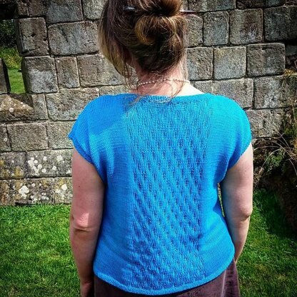 It is knit in the round from the bottom up, it begins with a seed stitch border, the panel pattern is then begun in the back as the body is worked up to the under arms. The front and back are split at the underarms and knit back and forth separately. The cowl neck panel is begun in the front and the droplet panel continues up the back. The cap sleeves are shaped with short rows and the shoulders are finished with a three needle bind off. The arms and neckline are edged with a seed stitch border which is knit with the main body of the top.