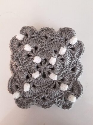 My block is 6 x 6 inches. Gauge will vary depending on your tension. This block looks great made in a solid color or multiple colors. I used a grey base and worked the pearls (popcorn st) in white. My thought was that when using this block in an afghan, the white popcorn stitches will create a diamond pattern.