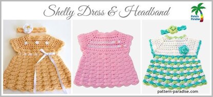 What a sweet dress & headband made with soft, feminine shells. Adorned with a pretty swirled rose that can be studded with pearls or other jewels is a perfect ensemble for her first photo shoot or any occasion.