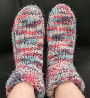These thick, quick knit, slipper-socks have a rib cuff then the foot is worked in stocking stitch, with a garter stitch sole. Warm, soft and so comfy to wear, you’ll never want to take them off!