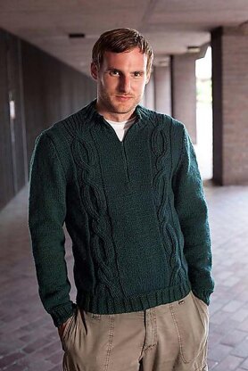 Man's zip neck pullover knitted in an aran weight yarn. The beautiful dark green of the Shilasdair inspired the name Sherwood. But it can be knitted in almost any aran weight yarn.
