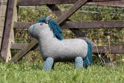 Shetland Pony is knit from the bottom up with a small amount of colourwork across the nose. Colourwork legs are knit separately and sewn on along with ears and a loop stitch mane. His tail is made from a long looping tassel.