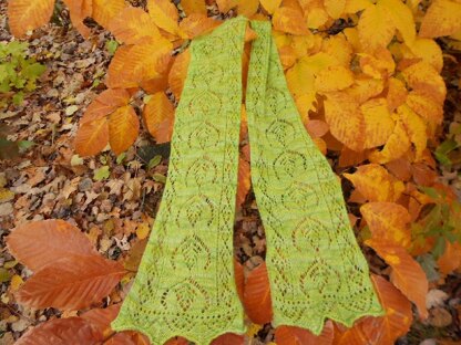 Imagine, if you will, a scarf as light as a breeze which floats through a fairy kingdom. The side panels and bottom edges reflect the fern pattern stitch that is knitted up the center of the scarf body. The scarf is knitted in two halves from the bottom up and joined in the center top. There are written as well as charted instructions for ease in knitting.
