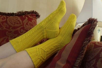This cabled sock has a shield motif on the outside edge of each leg and a simple cable on the other side of the foot. The socks are mirror images of each other, with each one presented with it's own unique chart in both a 64 and 72 stitch count top down sock.