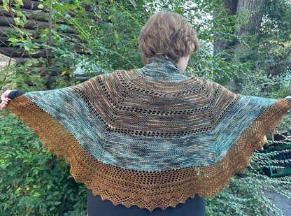 This is a semi-circular shawl featuring a lace knitted-on edging. It uses two skeins of coordinating fingering weight yarn, one in a tonal and one variegated. Instructions are given if you would like to make a larger size.