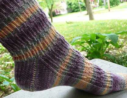A top-down sock in six sizes with a shifting rib pattern that extends down the leg and over the top of the foot, and is especially friendly with self-striping yarns. Easily converted to toe-up construction, as the pattern is vertically reversible.