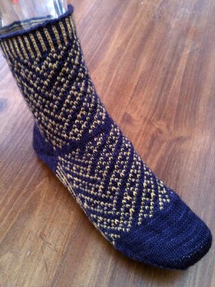 Bands of woven and solid stripes weave around the leg. Short Row "boomerang heel".