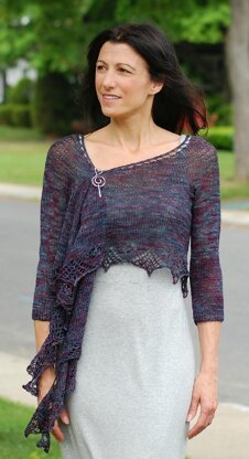 On sale at 25% off for the month of June 2017! A shawl with sleeves. Not a cardigan--it's truly a top-down crescent shawl, and will still need to be adjusted a bit to wrap around the front and the shoulders (just wrap it, and then give it a slight tug from the back). But it will stay on your shoulders and keep your arms warm while maintaining the freedom of movement that a cardigan affords. Sizing is flexible! It is based on your upper back/crossback width (see below) rather than bust size. People with a small upper back and shoulders (crossbacks smaller than 13”) will do best with size S, while those with mid-size shoulders and upper backs (crossbacks of 13-14.5”) will find more success with size M. The Large is sized for those with crossbacks measuring 14.5” and up. The samples were worked in Juniper Moon Farm Findley and The Verdant Gryphon Mithril. A substitute yarn is shown below.