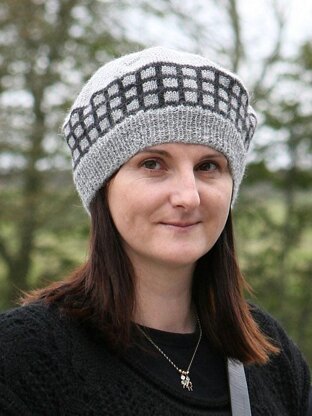 This is a slouchy beret, knitted in the round and worked in one piece from the bottom up. After casting on using a long tail tubular cast on method for 1x1 rib, the ribbed brim is worked before commencing onto a fairisle section to knit the trellis pattern. This is then followed by the crown shaping of the beret and an I-cord finish.