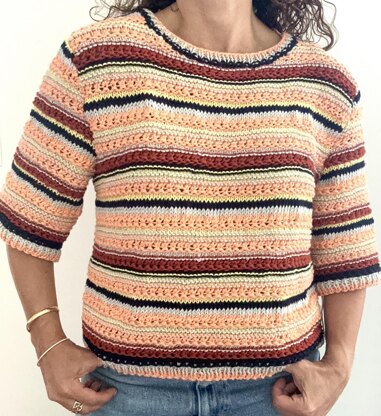 Ah, to feel the calmness and coolness with this relaxed knit tee. This pattern is knit with worsted weight cotton, and the color combinations are endless. It would even look great in a solid. It is styled with a loose and boxy body shape. The sleeves are set in so that it doesn't hang too loose off the shoulders in cotton yarn.