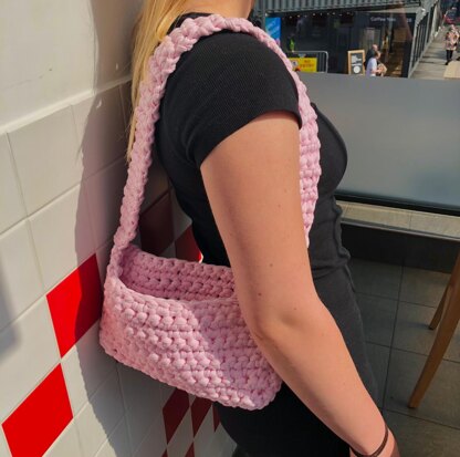 This pattern is for a small shoulder bag, measuring roughly 5.5x10x2 inches, with a 25 inch strap. Light and comfortable to carry and very versatile.