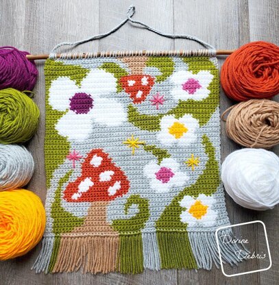 Shrooms and Blooms, need I say more? This design is a fun and colorful bottom up wall hanging that’s worked in back and forth rows and all single crochet. Be sure to change colors on the final pull through of your stitch and block your finished piece for optimal results. Customize your design with fringe and stars to really add more whimsy :D
